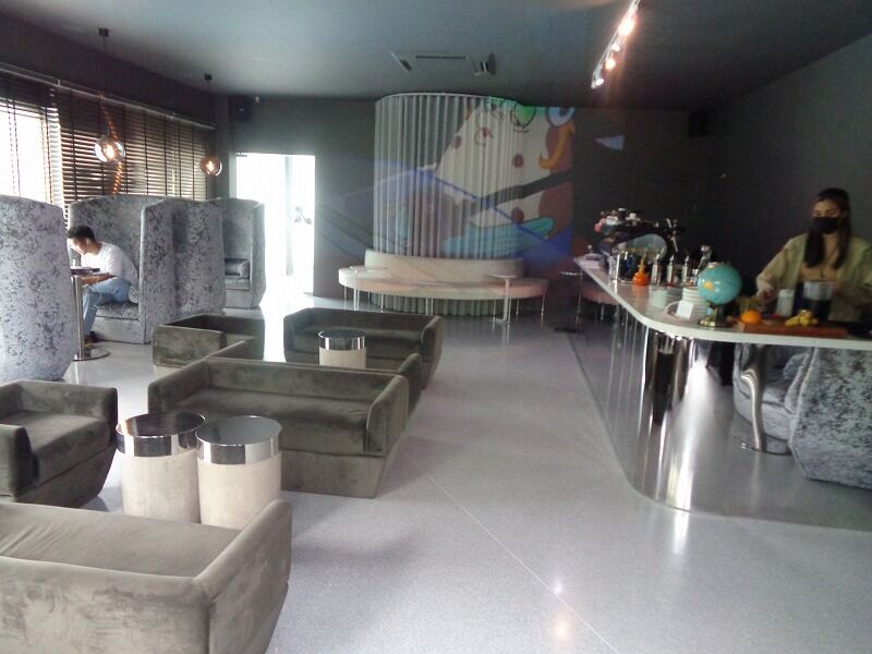 プールのそばにある建物の2階には、コーヒーラウンジがあります。