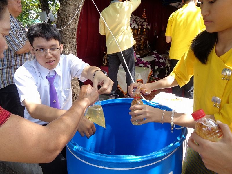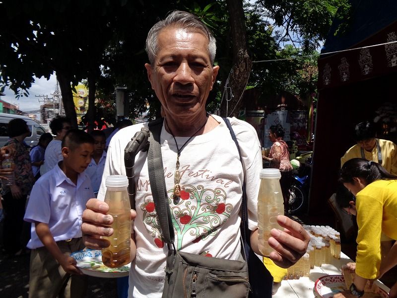 儀式が終わり、参列者は帰る時に黄色の聖水の入ったペットボトルが貰えました。
