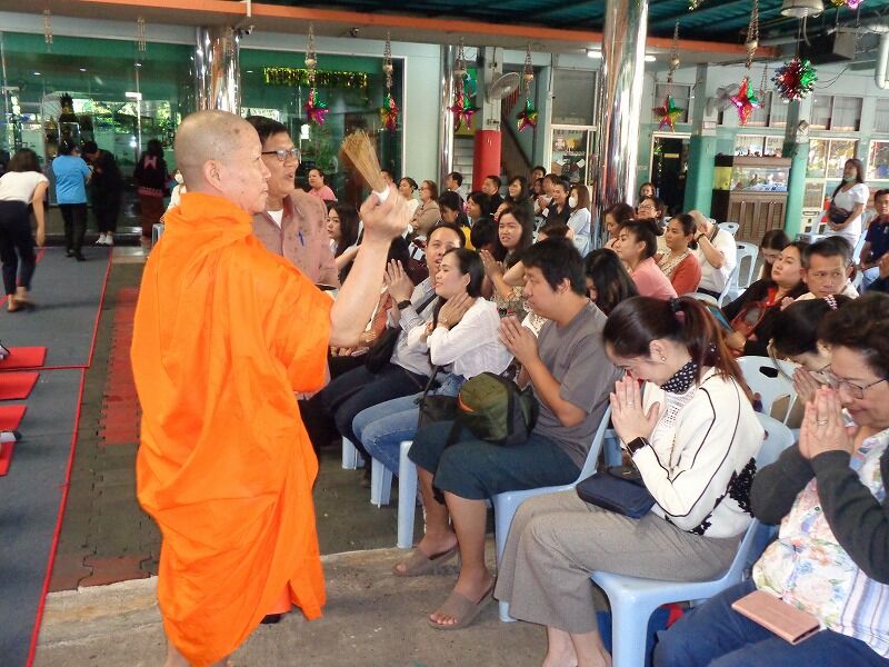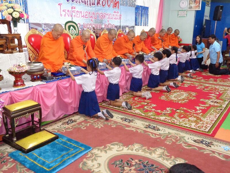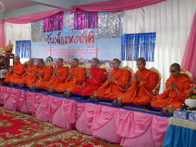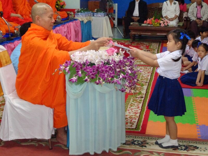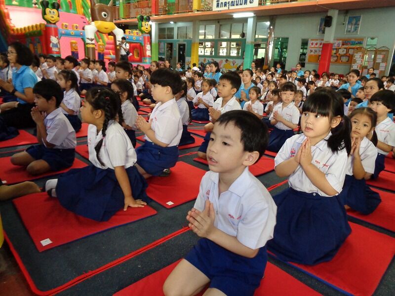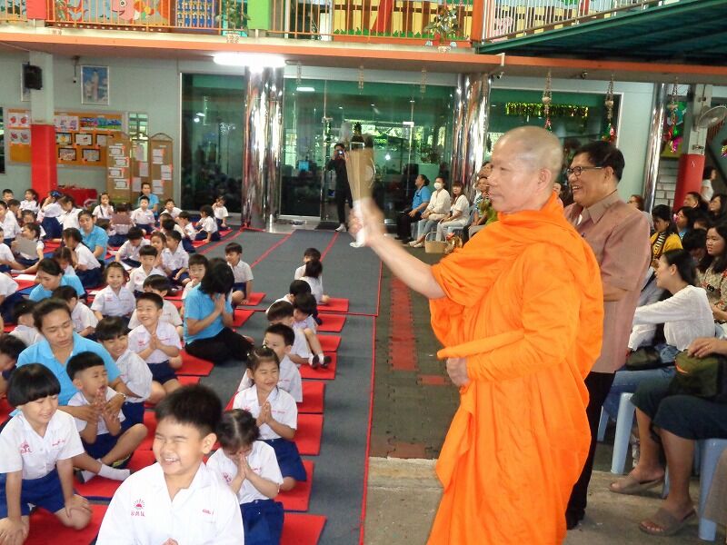 この幼稚園では、学校行事の時は、僧侶をお招きして、タイ仏教の作法も教えています。