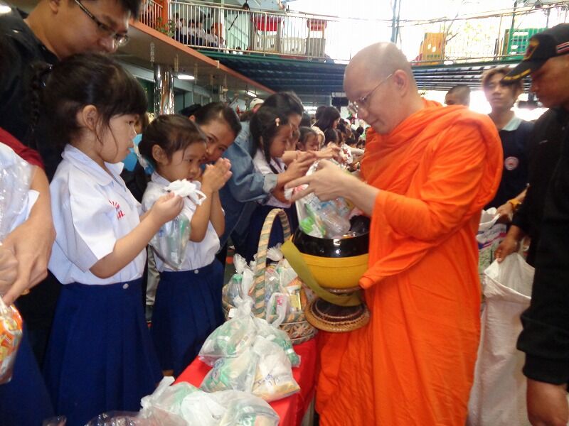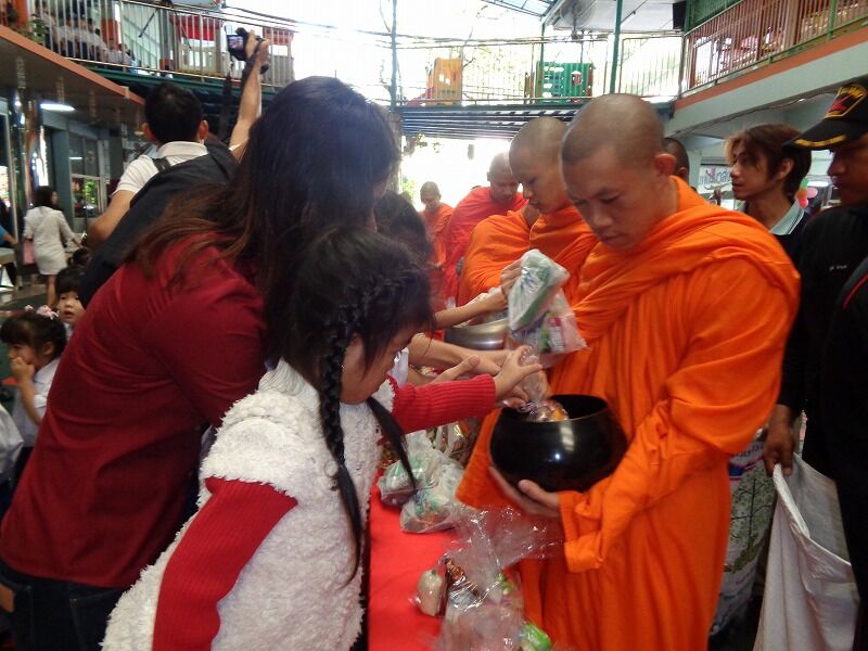 園児たちが僧侶にタンブン(寄進)をしています。