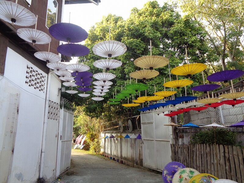 ボーサン村の商店街はたくさんのカラフルな美しい傘が飾り付けされていました。
