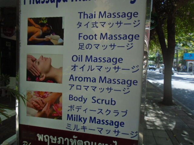 意味ありげなマッサージ店(?)も日本語で。