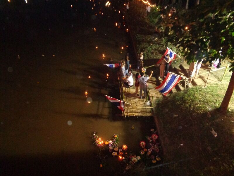 ピン川では、たくさんの人がクラトン(灯籠)流しをしていました。