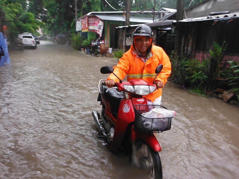 道路も浸水し、オートバイに水が入り、故障して、歩いて動かしています。