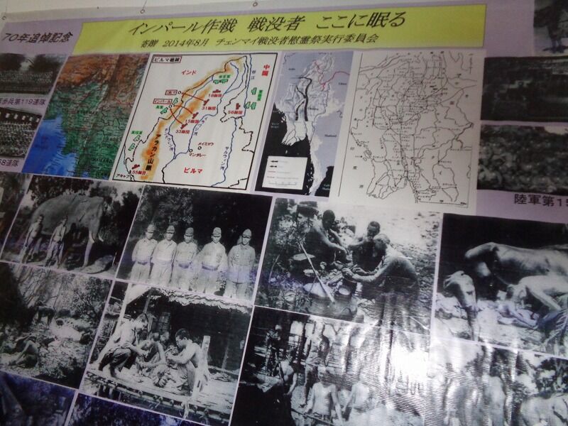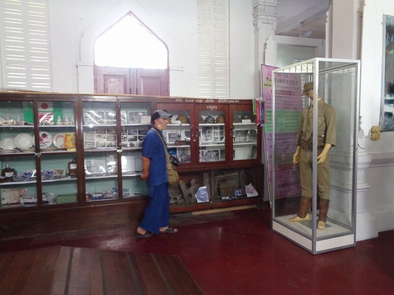 このお寺の正門から入ると、正面に本堂があります。その左側の建物が郷土資料館です。その前に慰霊碑が建てられています。タイは雨期に入っているので、地元チェンマイの人たちの協力のおかげで青いテントも張られていました。