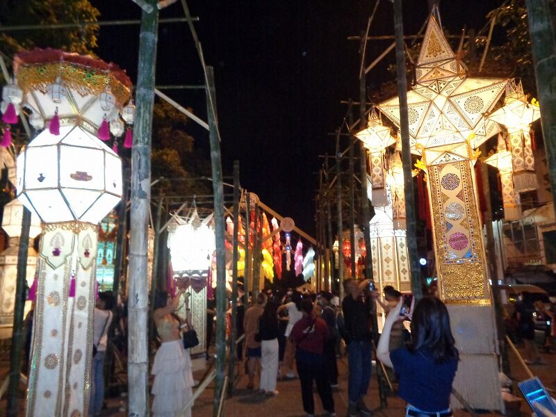 ターペー門前広場の北側では、ランナー提灯や燈篭の飾り付けがあり、華やかな雰囲気を演出していました。