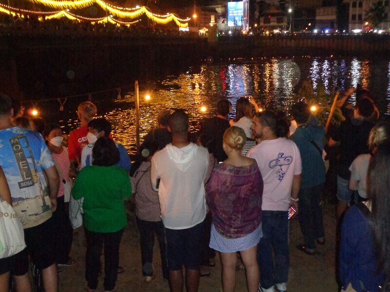 『ローイクラトン祭り』の2日目(8日)の夜、大ぜいの人が集まっているピン川のナワラット橋に行きました。そこでは、川の中に、多数のクラトン(灯篭)の灯りが流れ、幻想的な雰囲気に包まれていました。しかし、今年は夜空には、名物のコムローイ(熱気球)を飛ばすことは禁止されていました。