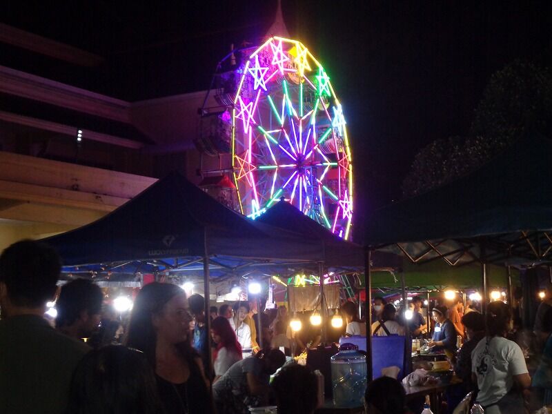 ナワラット橋の近くにある仏教会館では、夜店が開かれて、大ぜいの人で賑わっていました。また、旧市街のターペー門前広場では、美男子、美人コンテストの決勝戦が行なわれていました。