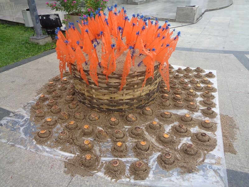 この祠堂の中にある守護神の柱は『仏像の下の台座の部分』です。そこにもたくさんのお花がお供えされていました。