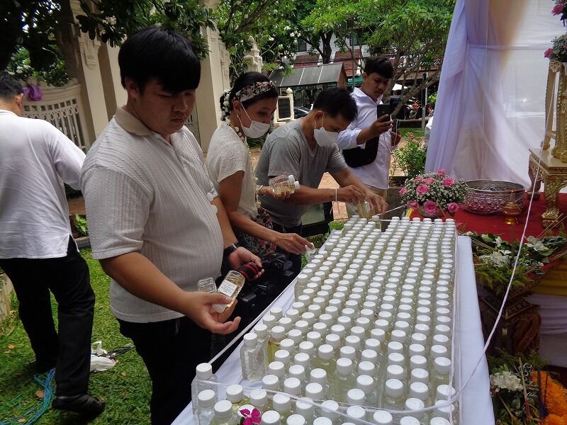 108の鉢に硬貨を入れ、タンブン(寄進)をしています。