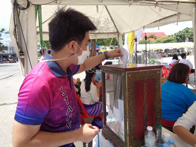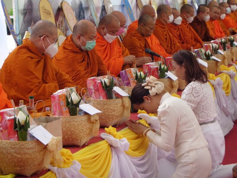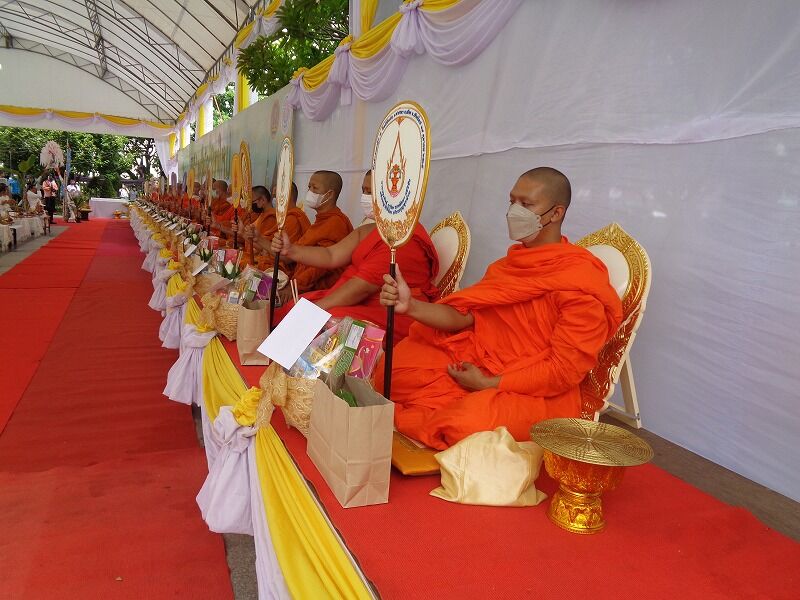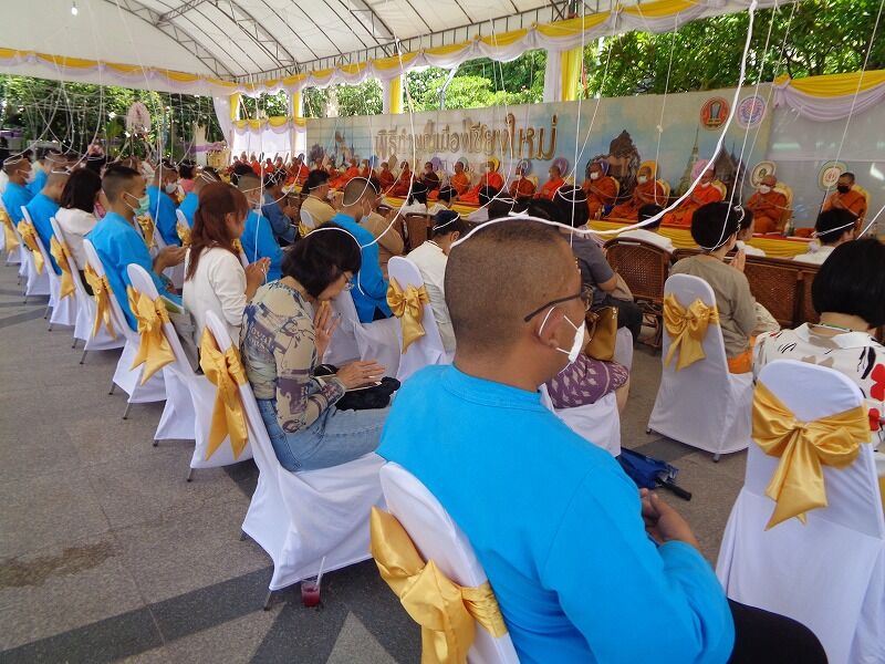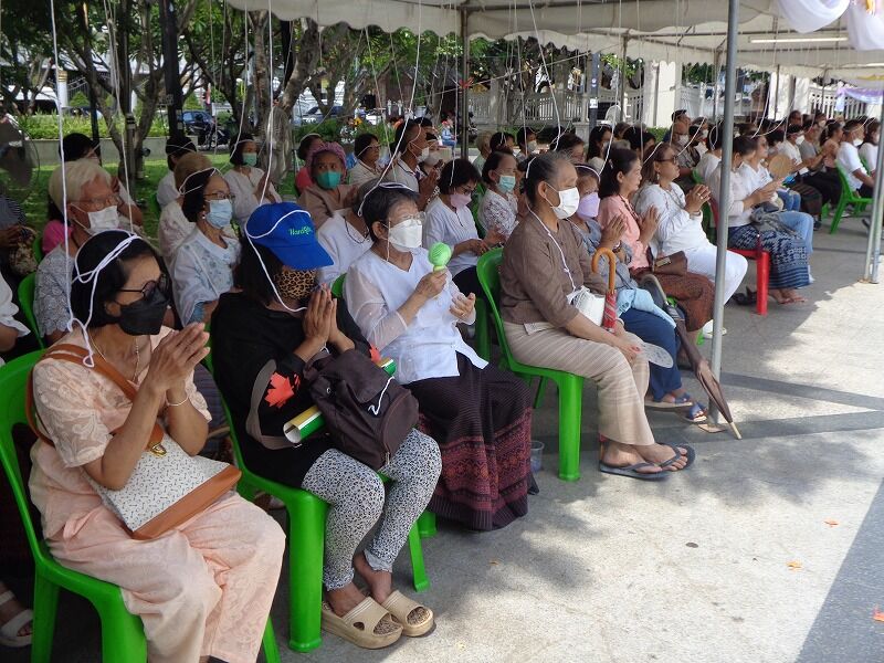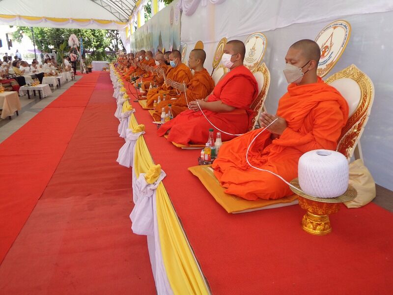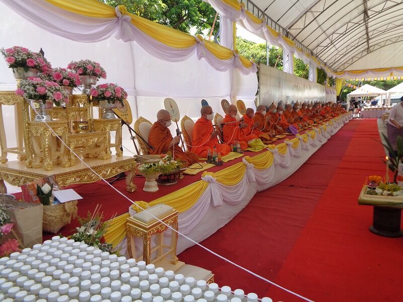大きなテントの中で僧侶が読経し、チェンマイの平穏を祈願しています。