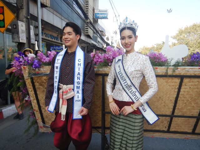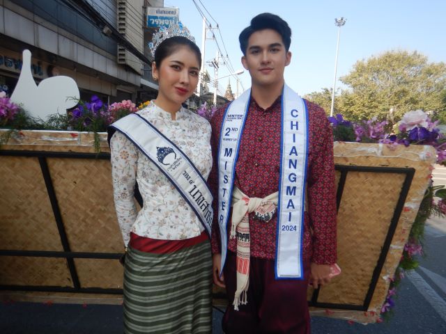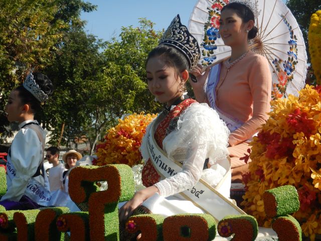 チェンマイ『花祭り』のハイライトである華麗な花飾り山車パレードが2日目(3日)の午前中に行なわれました。