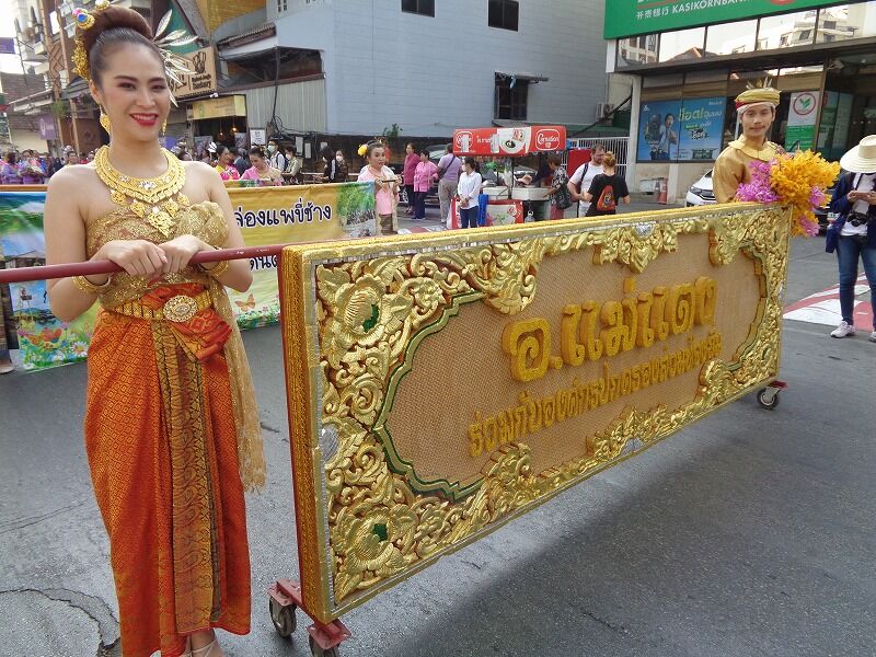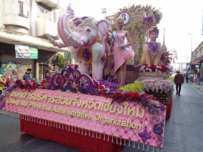 チェンマイ『花祭り』の2日目4日(土)の午前中は、盛大に華麗な花飾り山車パレードが行なわれました。そのパレードには、チェンマイ県の各地域からも出場していました。チェンマイ県の面積は20、107平方m(京都、岩手県を合わせたくらい)、県人口は約170万人です。