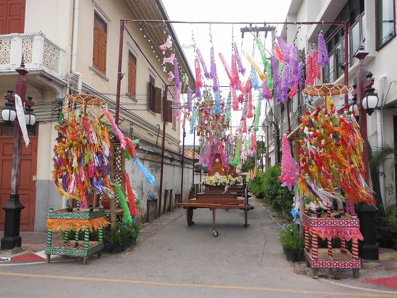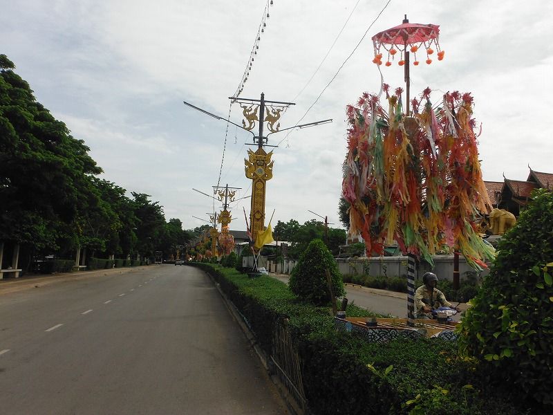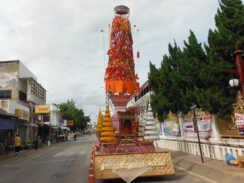 『サラークヨーム』(右下)では、長い竿をきれいに飾り、日用品や食品などをぶらさげたものをお供えします。他のお寺でも行われますが、ランプーンのものは規模が大きいので有名です。ランプーン県では、ランプーンの特色ある伝統行事や文化を観光と結びつけて、地域の活性化を図ろうとする取り組みが熱心に行われています。