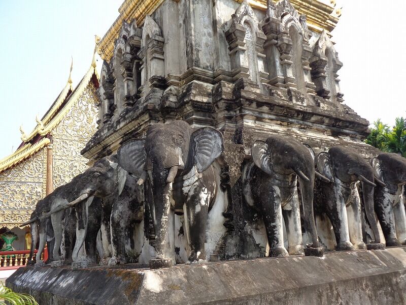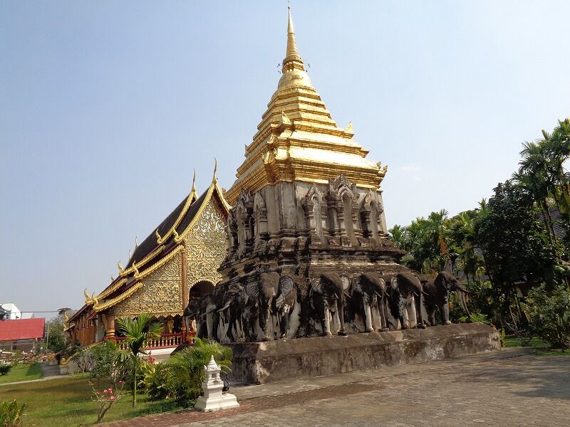 大本堂の裏にあるランナー様式のチャーンローム仏塔(象の仏塔)は、1297年ワット・チェンマンと同じ頃に建立されました。