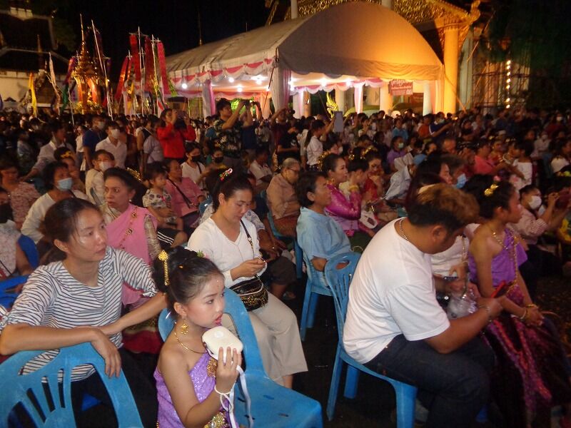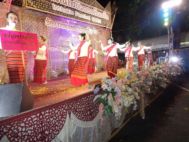 私は最終日の6月9日の夜にお寺に行きました。境内には大ぜいの参拝者がかごにお花を一杯入れてお参りしていました。特設ステージでは、チェンマイの伝統舞踊などが披露されていました。